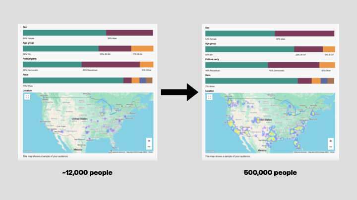That’s why we built a donor lookalike engine. This tool takes a list of your existing donors, matches them to our extensive voter database, figures out what’s unique about them, and finds totally new people who share their traits. You could take a list of 1,000 existing donors and turn it into 20,000 brand new donor prospects.